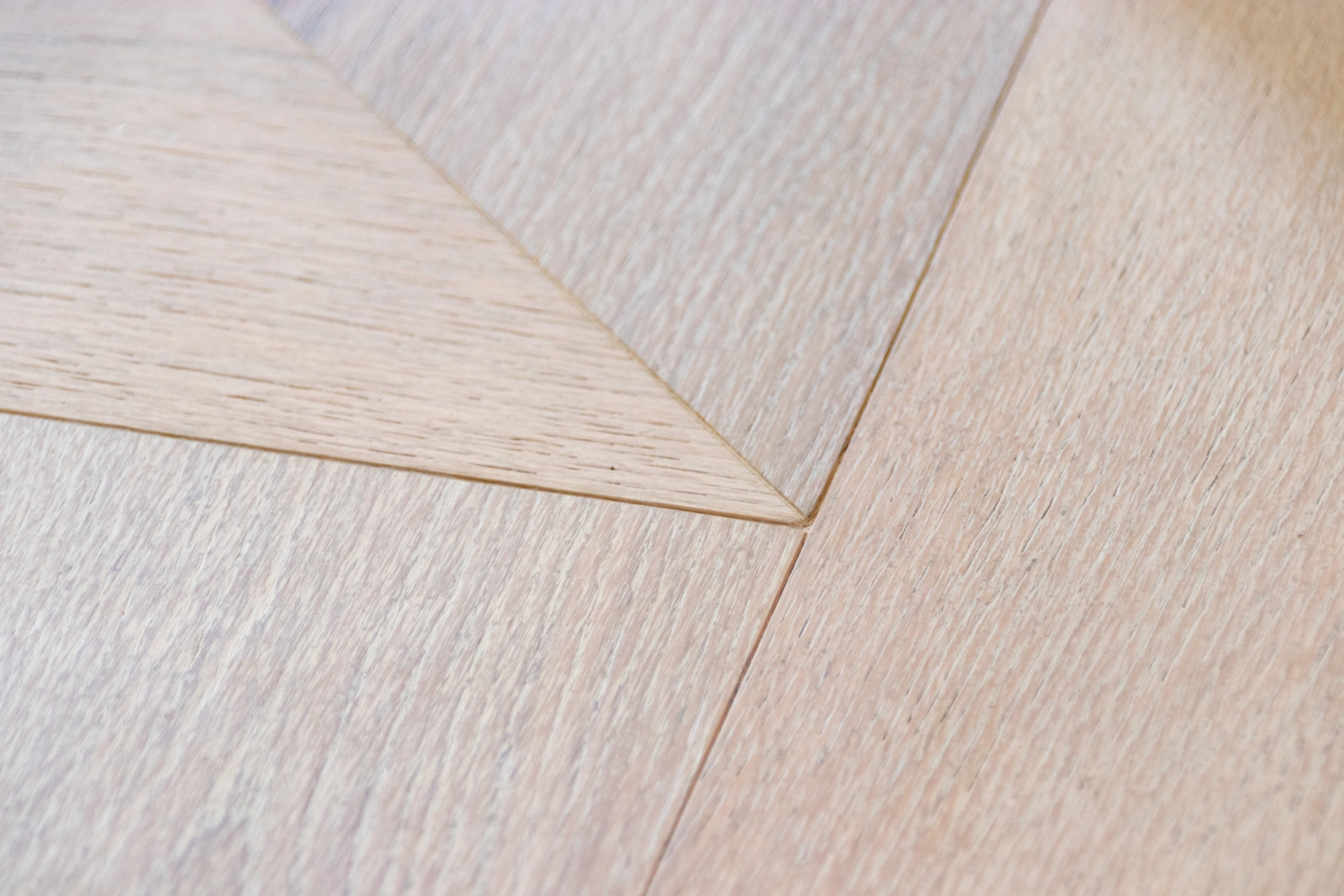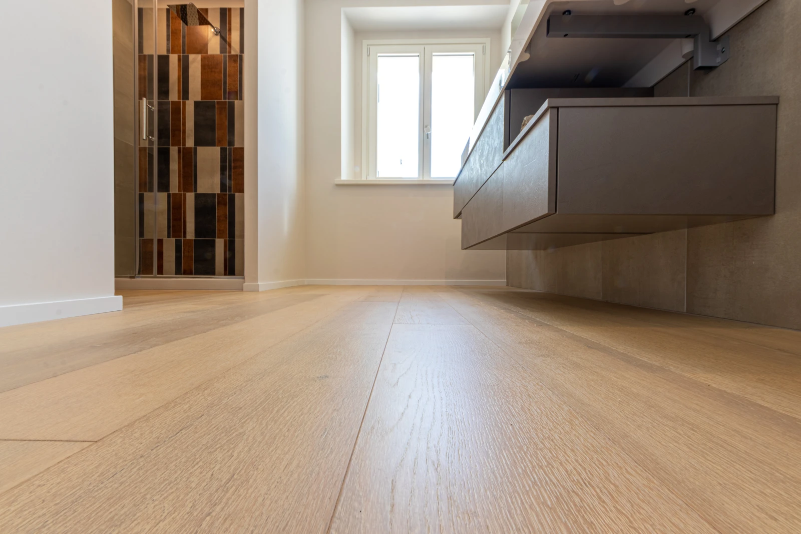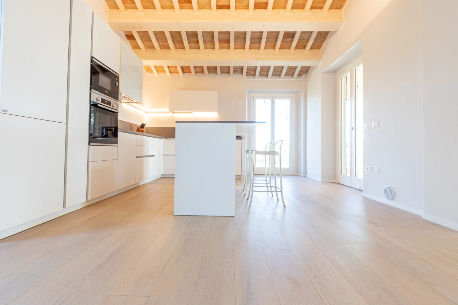 Il Rovere sbiancato illumina l’open space con delicatezza, accompagnando la presenza scenografica della scala in un fluire continuo di equilibrio e leggerezza.