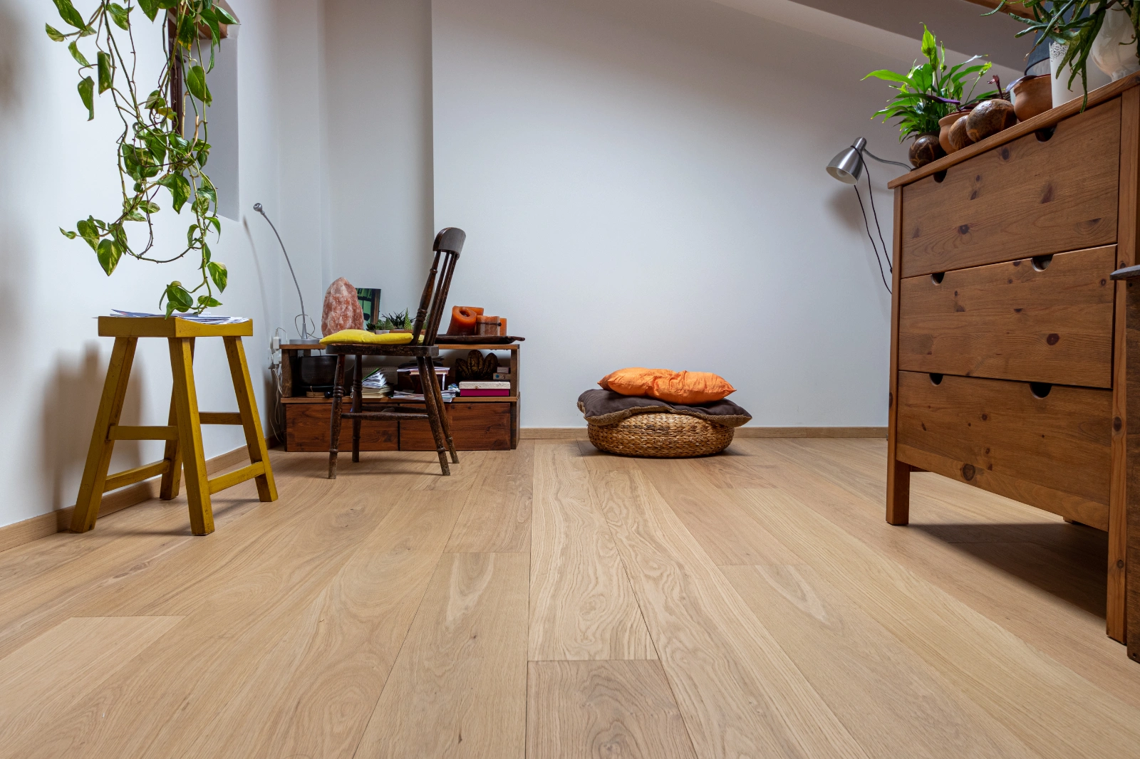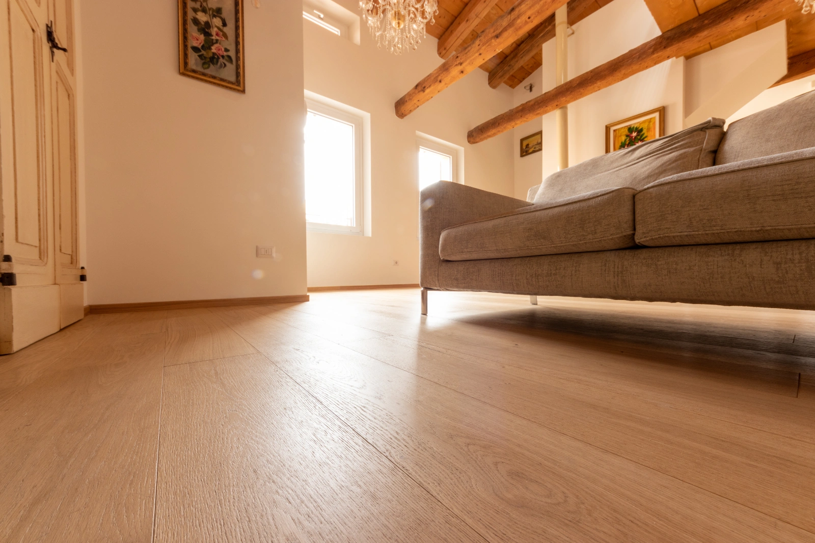A Pesaro, il Rovere senza nodi in tinta naturale amplifica la luminosità dello spazio, armonizzando la purezza del parquet con la forza autentica delle travi a soffitto.